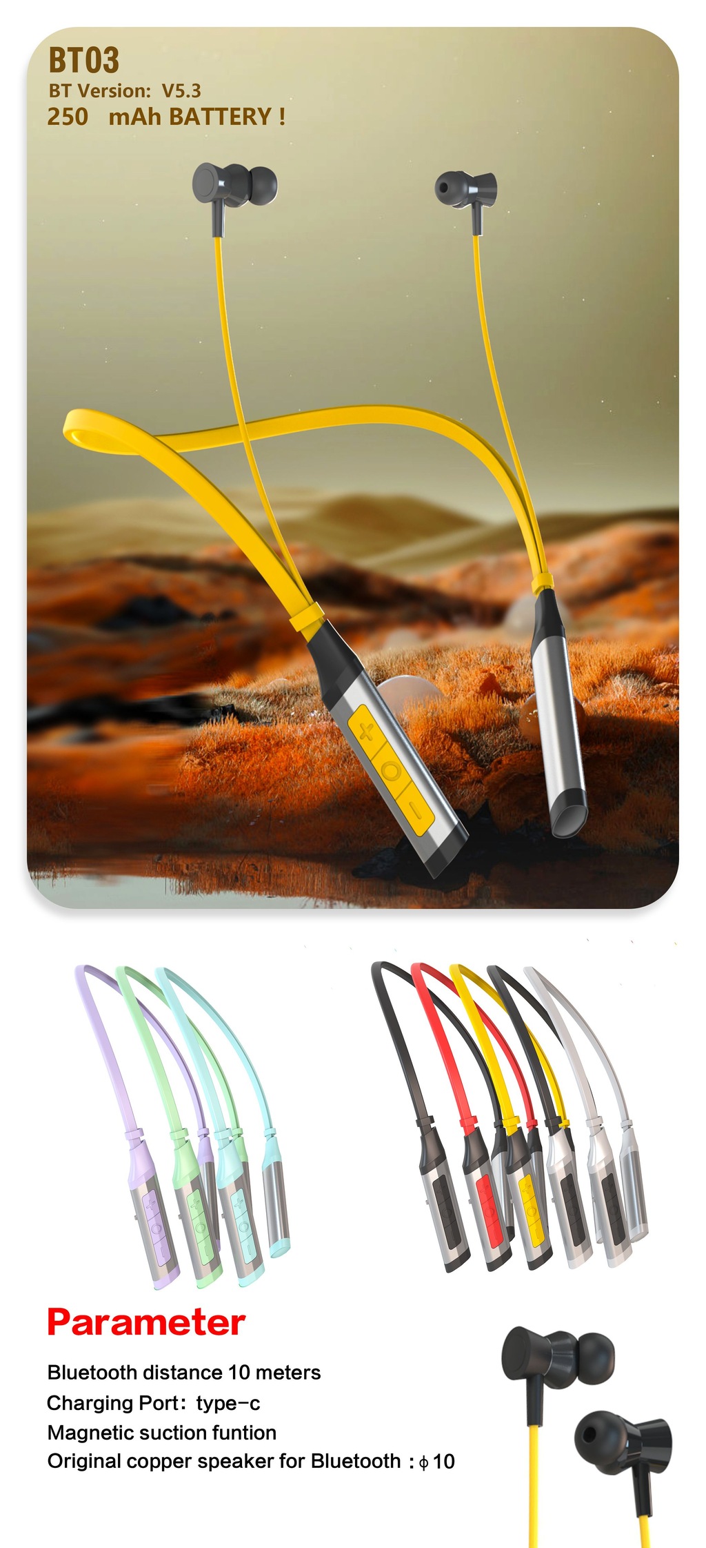 BT03颈挂脖式蓝牙耳机/超长续航待机/大电量无线防降噪音运动耳机入耳式适用于华为苹果oppo小米vivo /超重低音+超长续航/挂脖耳机工厂/批发/定制